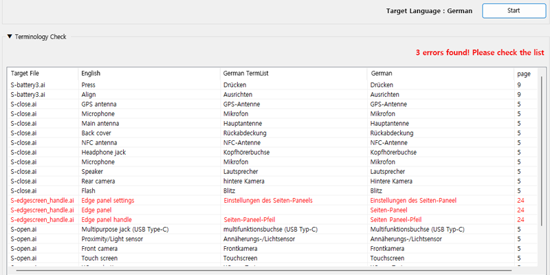 In the above example case, the tool automatically detected multiple German-term issues where the manual did not match the approved term list or contained missing translations.