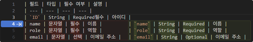 - “선택” (Optional) in the Required/Optional column is automatically converted to “Optional” based on the context.