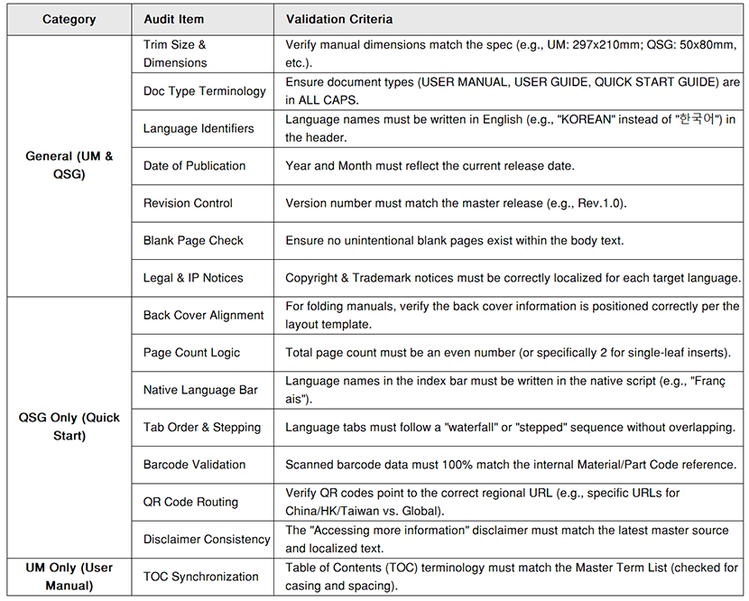 A release-stage manual must pass a set of non-negotiable checks: the “must be correct” items that protect shipment, compliance, and liability posture. The list grows quickly as product variants and languages increase, because many checks must be verified per language and per output format.