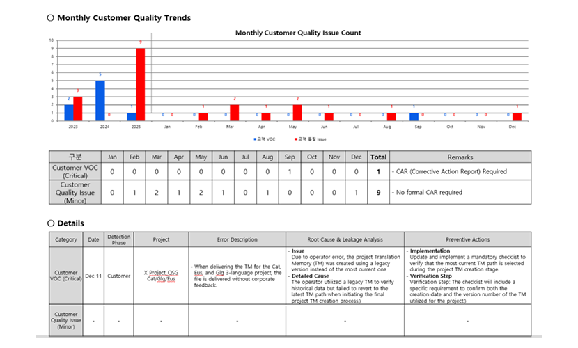 When a defect is found, we trace why it passed internal filters—where it escaped, and why. Then we implement system-level countermeasures through CAPA (Corrective and Preventive Action). A single human error must lead to a stronger system: updated checklists, improved version-control rules, and tighter TM application protocols—so recurrence becomes structurally difficult.